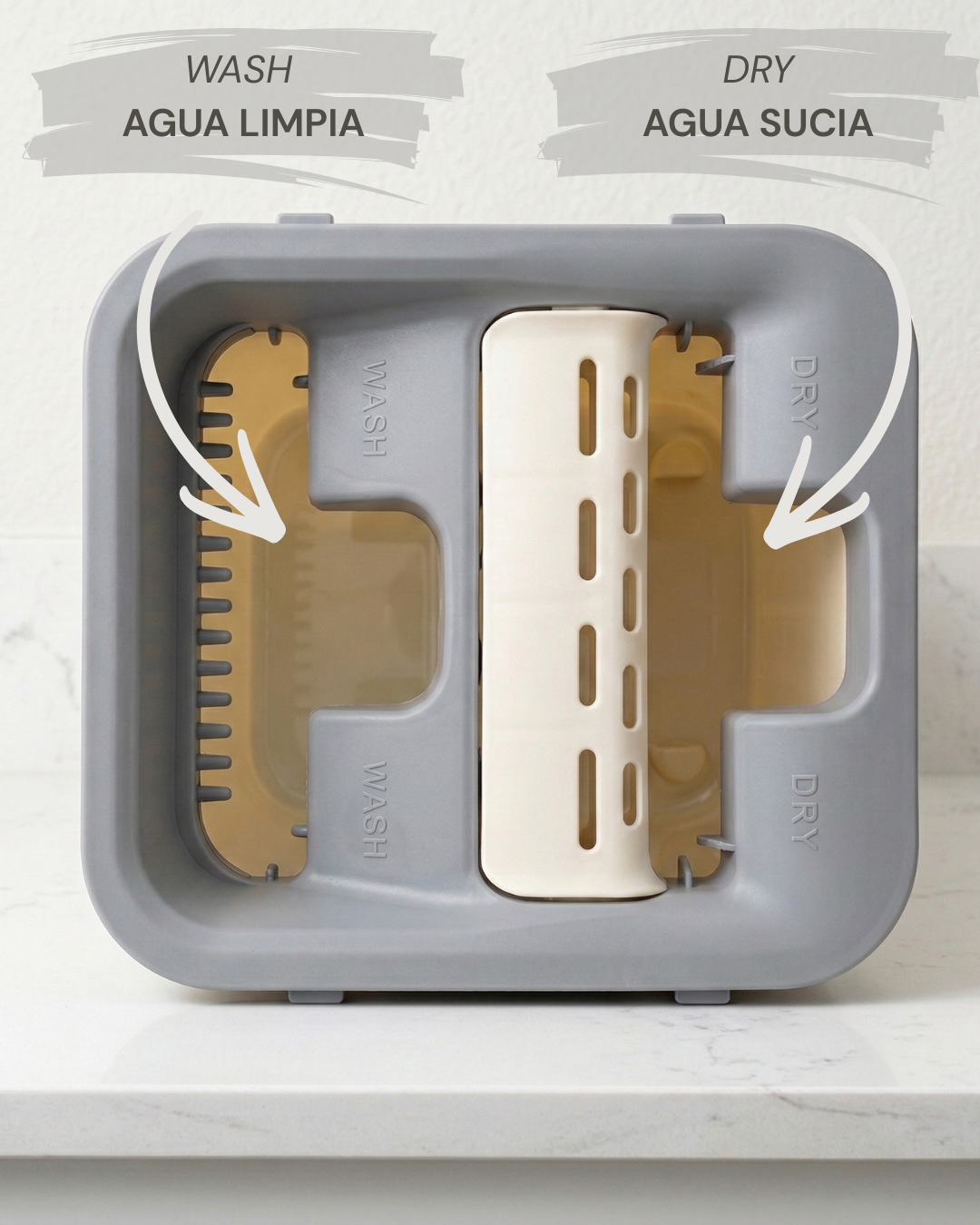 - Zona de agua sucia: equipada con sistema de prensado que retira el exceso de agua, dejando la mopa con el nivel de humedad adecuado para limpiar sin encharcar.