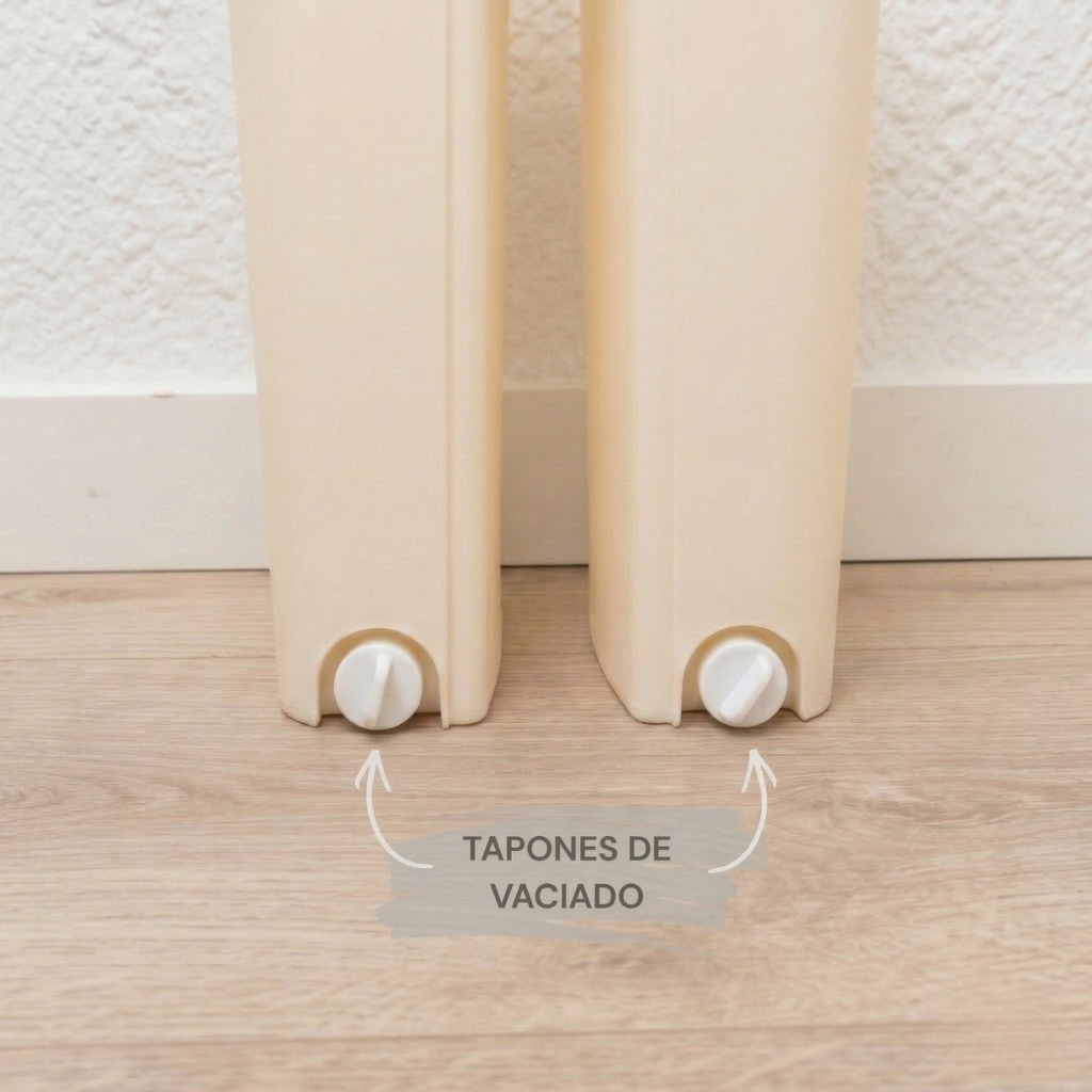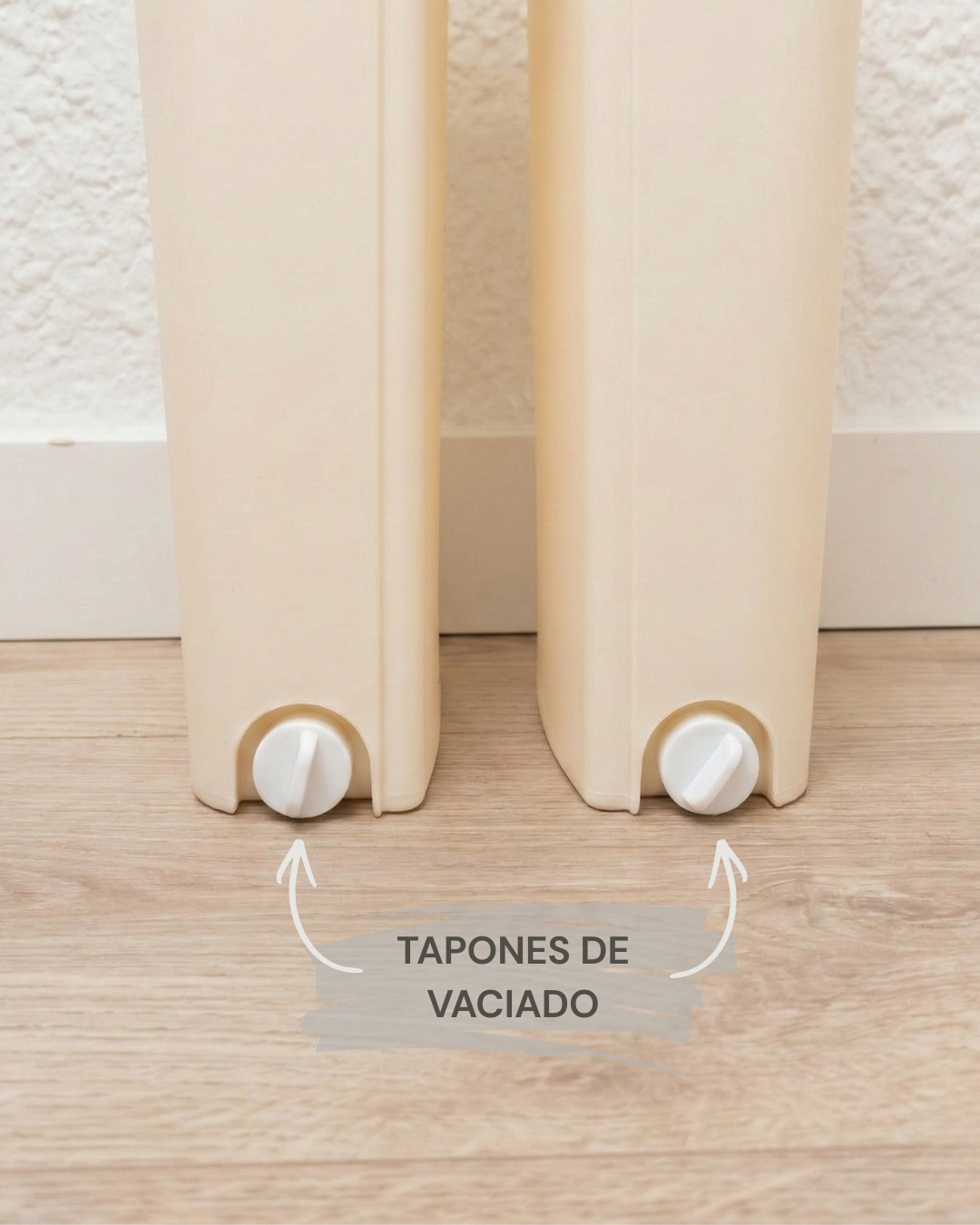 El cubo dispone de dos orificios de vaciado inferiores, cada uno con tapón de goma hermético, que permiten drenar el agua de forma rápida y cómoda sin necesidad de inclinar o levantar el cubo.
