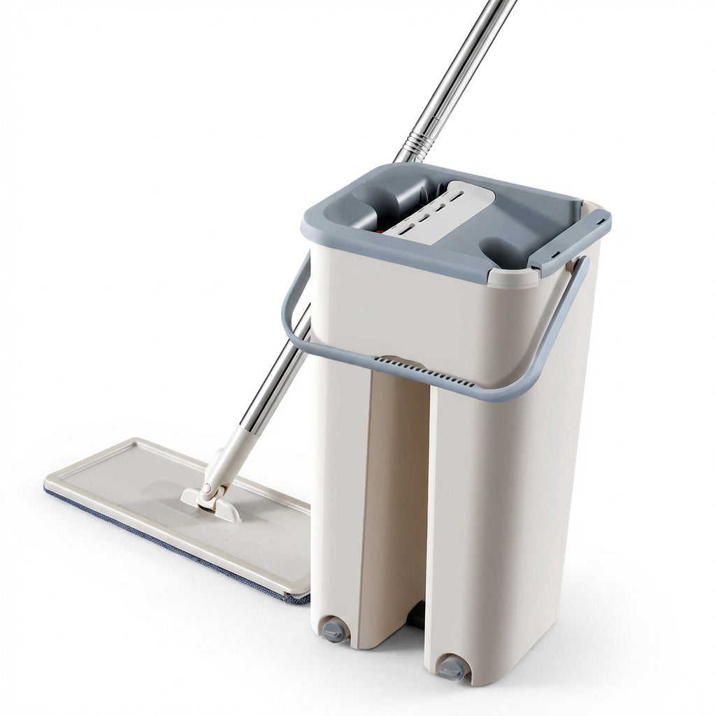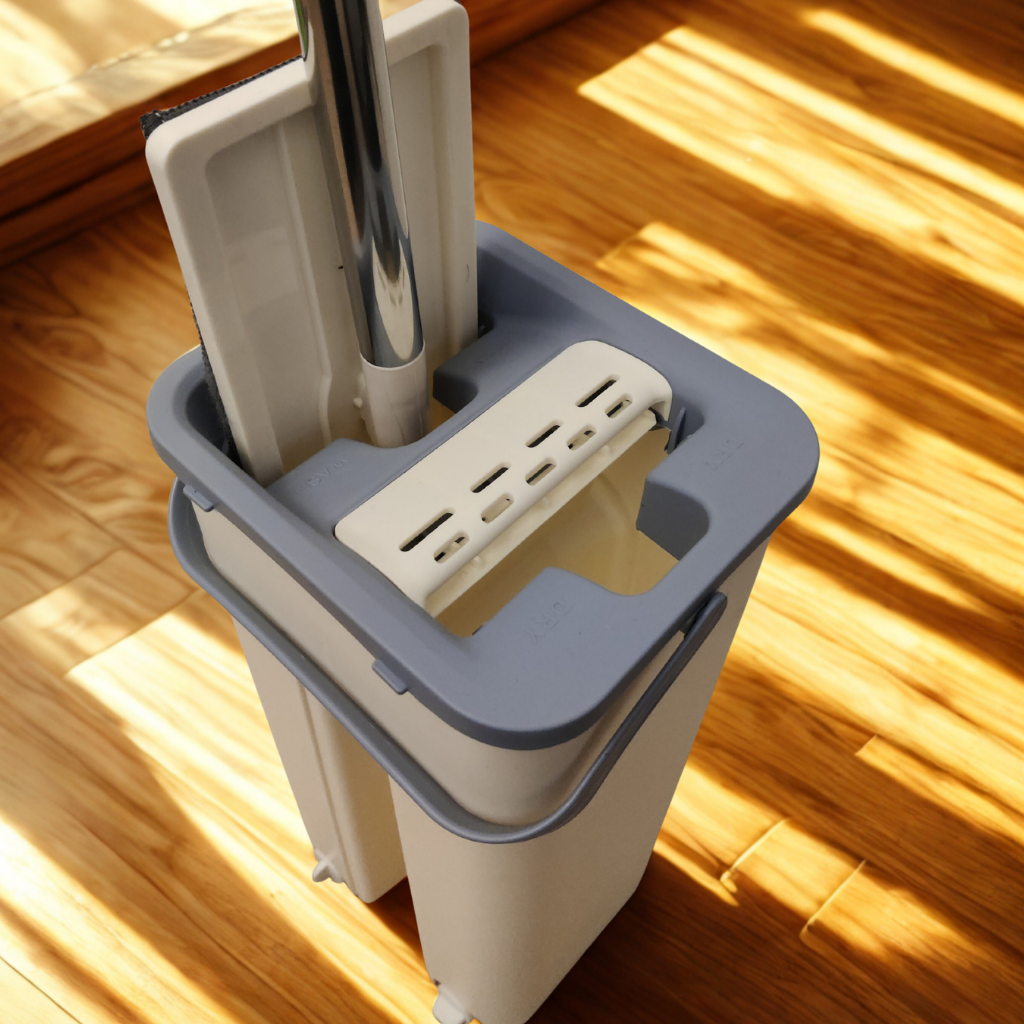 Mopa con cubo escurridor que incorpora un sistema de doble compartimento que separa el agua limpia de la sucia, permitiendo una limpieza más higiénica. Cuenta con cabezal plegable, microfibra absorbente y tapones de vaciado en la base del cubo para vaciar el agua de forma cómoda. Diseñada para una limpieza práctica y eficiente del hogar.